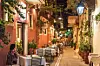 FERIE PÅ KRETA: Uterestaurant i en smal, opplyst gate viser den stemningsfulle kveldsatmosfæren som møter pakkereiseturister på øya.
