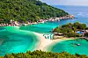 Turkis hav, hvit sandstrand og frodig natur på Nang Yuan Island ved Koh Tao viser hvorfor Thailand er et populært reisemål for sol- og badeferie.