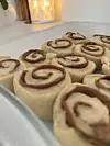 - Kjevle ut deigen, smelt ned Dumlesjokolade og hell over karamellen (obs! karamellen må smøres ut med én gang). Rull deigen sammen og skjær opp kanelsnurrer i ønsket størrelse. Vi stekte våre tett i tett i ildfast form. Det er også mulig å ha de på stekebrett, men da må man påregne at det kan renne ut karamell.