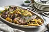 Kutt opp løk, poteter, pastinakk og hvitløk. Ha alt i en ildfast form og krydre med salt og pepper.