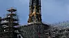 Spiret, som kollapset på dramatisk vis under brannen, er igjen synlig etter at stillaset rundt nylig ble fjernet.