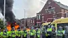 Politibiler har blitt satt fyr på og en politimann har fått brukket nesen, opplyser politiet i Merseyside. Opprørspolitiet var utstyrt med skjold og forsøkte å dytte demonstrantene tilbake.