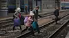 En video tatt søndag viser øyeblikket en ukrainsk soldat går på innsiden av en barrikade i den ukrainske hovedstaden Kyiv. Bak ham kan man så vidt skimte en småbarnsfamilie med bagasje på slep.