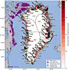 Grafikken viser hvordan landjorda i Grønland beveger seg horisontalt. Dette er målt av 58 GPS-stasjoner. Pilene viser hvilken vei bakken flytter seg. Fargen på høyre side viser hastigheten per år. Det store, hvite feltet er den digre innlandsisen, breen Grønlandsisen.