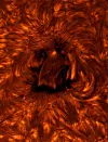 Dette bildet vant i sol-kategorien. Her ser du en del av solens kromosfære. Det er den innerste delen av solens atmosfære. Den blir vridd og vendt på av ekstreme magnetfelt som oppstår og flytter seg på soloverflaten.
