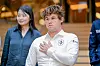16 år gamle Materia, som var Carlsens motstander i første parti, møtte opp i hettegenser til møtet med nordmannen.