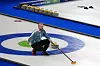 Norges skipMagnus Ramsfjell i aksjon under OL-bronsekampen i curling mot Sveits.