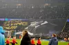 Gjestene ble møtt av en enorm «tifo» før tirsdagens playoffkamp på i Manchester. Banneret gjorde narr av brasilianerens andreplass i Gullballen og Reals boikott av seremonien.